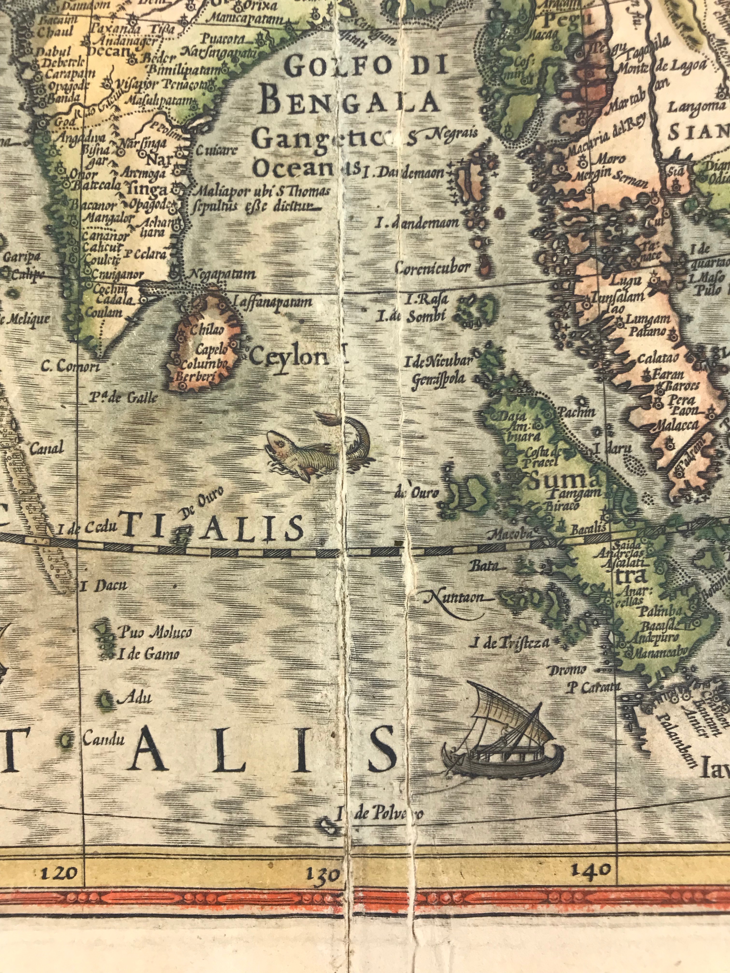 ASIA -- "ASIAE NOVA DESCRIPTIO". (Amst., Mercator-Hondius, c. 1620). 375 x 506 mm. Engr. map in cont. colouring w. 3 cartouches. (A bit browned, v° side w. several repairs, a bit dam. on centrefold and on a second vertical 'false' fold, tear visible in left outer corner, margins ample). Under passepartout.