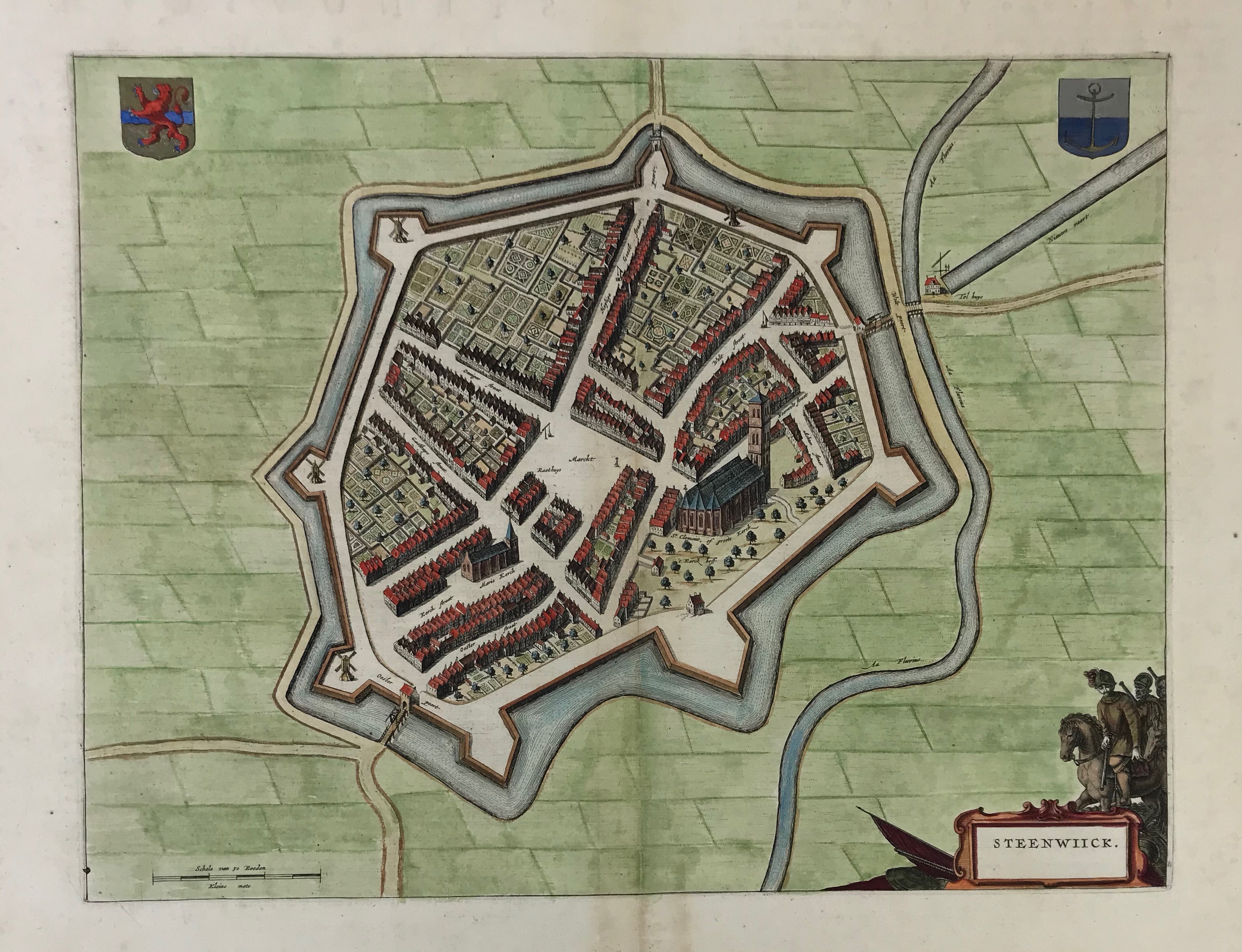 LOW COUNTRIES -- "SWOLLA". (Amst.), J. Blaeu, (c. 1650). Plain engr. bird's eye plan of Zwolle, w. 2 coats of arms and 2 cartouches. 415 x 525 mm. (Split on fold rep. at v° side, but in very good condition w. ample margins). -- Added: "STEENWIICK". (Amst.), J. Blaeu, (c. 1650). Handcold. engr. bird's eye plan of Steenwijk w. 2 coats of arms, scale indicator and inscribed cartouche. -- (2).