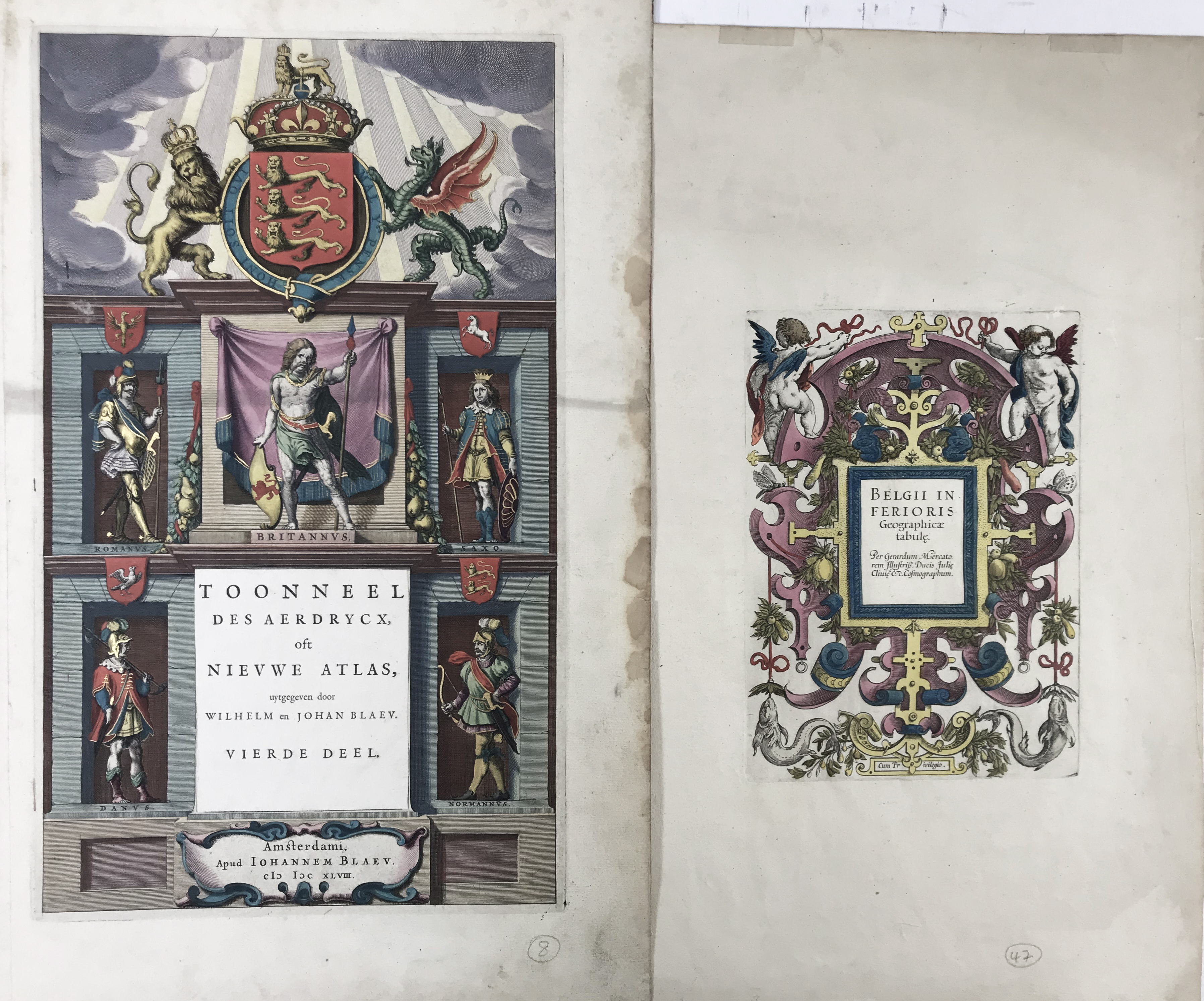 VARIA -- COLLECTION of 4 engr. title-pages from atlases published by Mercator/Hondius (n.d.), Blaeu (1648), Janssonius (1652) and Doncker (1673). All cold. by hand, partly heightened w. gold. Largest 420 x 260, smallest 230 x 165 mm. 1 in passepartout.