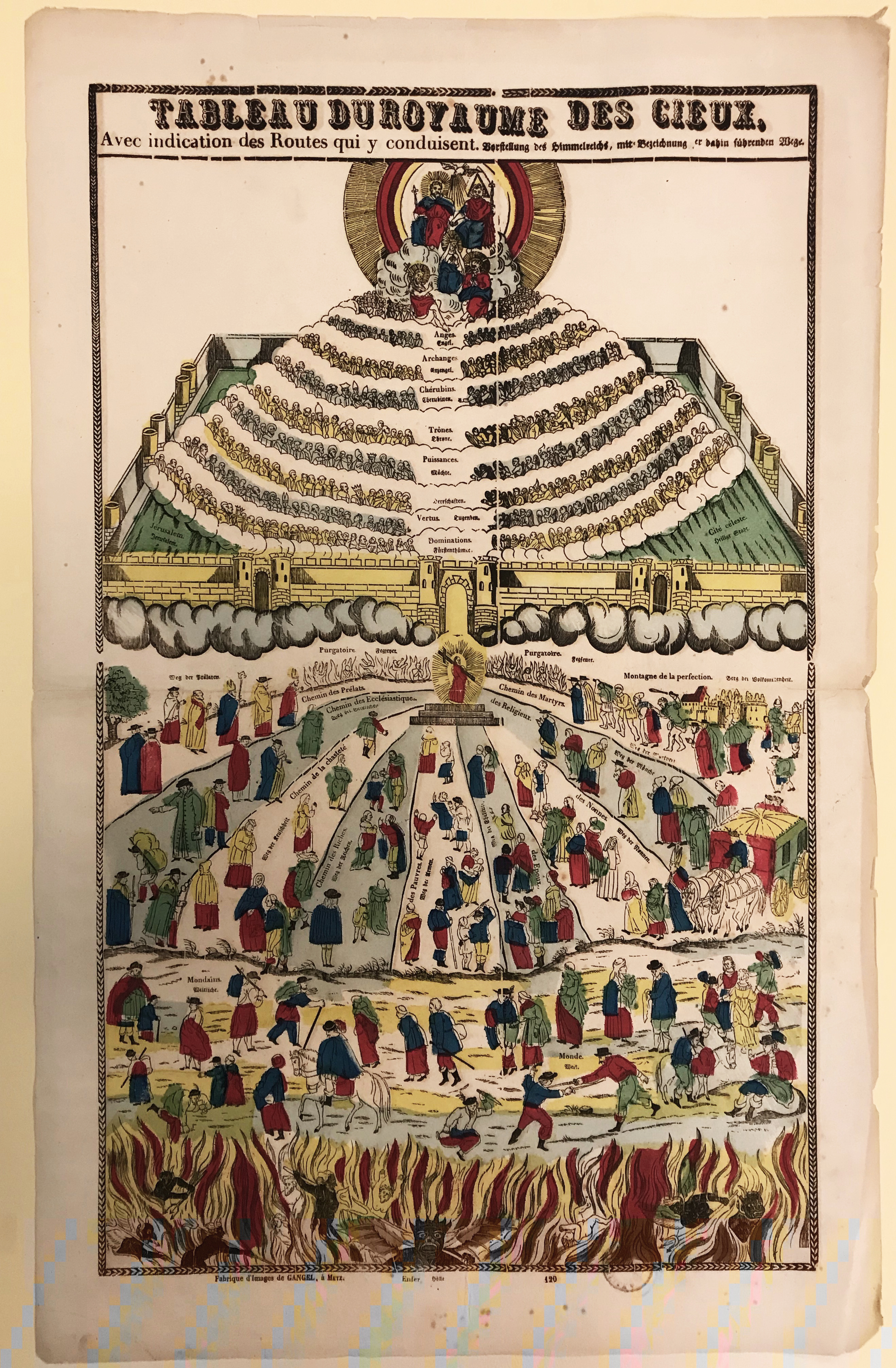 CATCHPENNY & POPULAR PRINTS -- RELIGION -- "MOURANT, Le, prèt a paraitre devant Dieu". -- "L'ENFANT PRODIGUE". -- "TABLEAU du Royaume des Cieux, Avec indication des Routes qui y conduisent". -- "NOTRE-DAME DE HALL". -- "L'HEUREUSE BÉNÉDICTION Des Familles et des Maisons". -- "JUGEMENT et Condamnation de Jesus, prononces a Jerusalem le 3 Avril 34 de l'ère chrétienne". -- Metz, Gangel/Dembour & Gangel, c. 1850. 6 stencil cold. wood-engr., all c. 650 x 410 mm. 5 tipped in under passepartout. (Some minor wear to margins, but in very good condition). -- And 7 o., incl. 6 prints published by Gangel. (13).