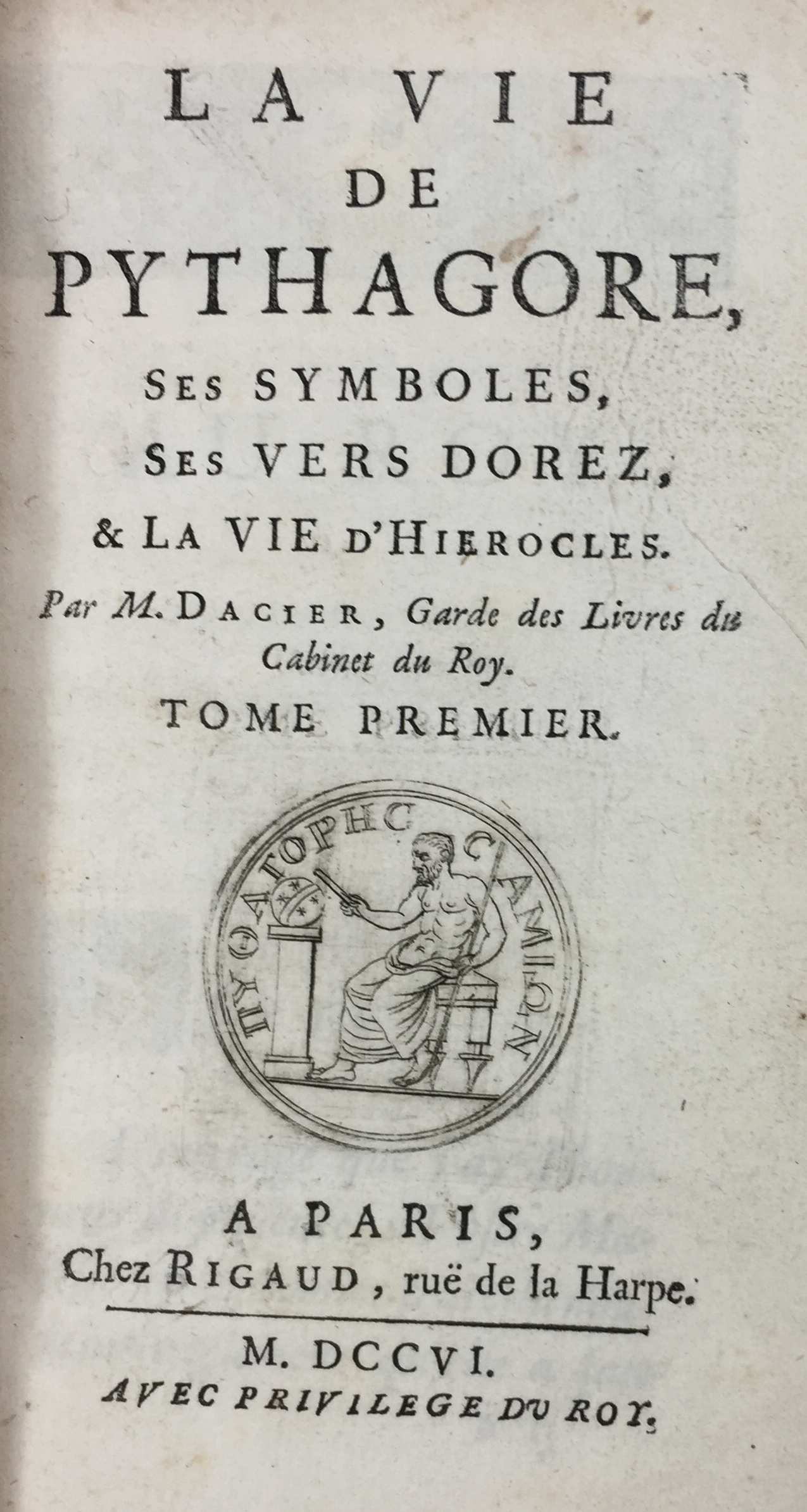 DACIER, A. la vie de Pythagore, ses symboles, ses vers dorez, & la vie d'Hierocles. Par., Rigaud, 1706. 2 vols. (20), 273, (67); (2), 431, (1) pp. W. engr. ti-vign. Cont. cf. w. raised bands, dec. gilt backs. (Top of spines slightly chipped, else an excellent set).