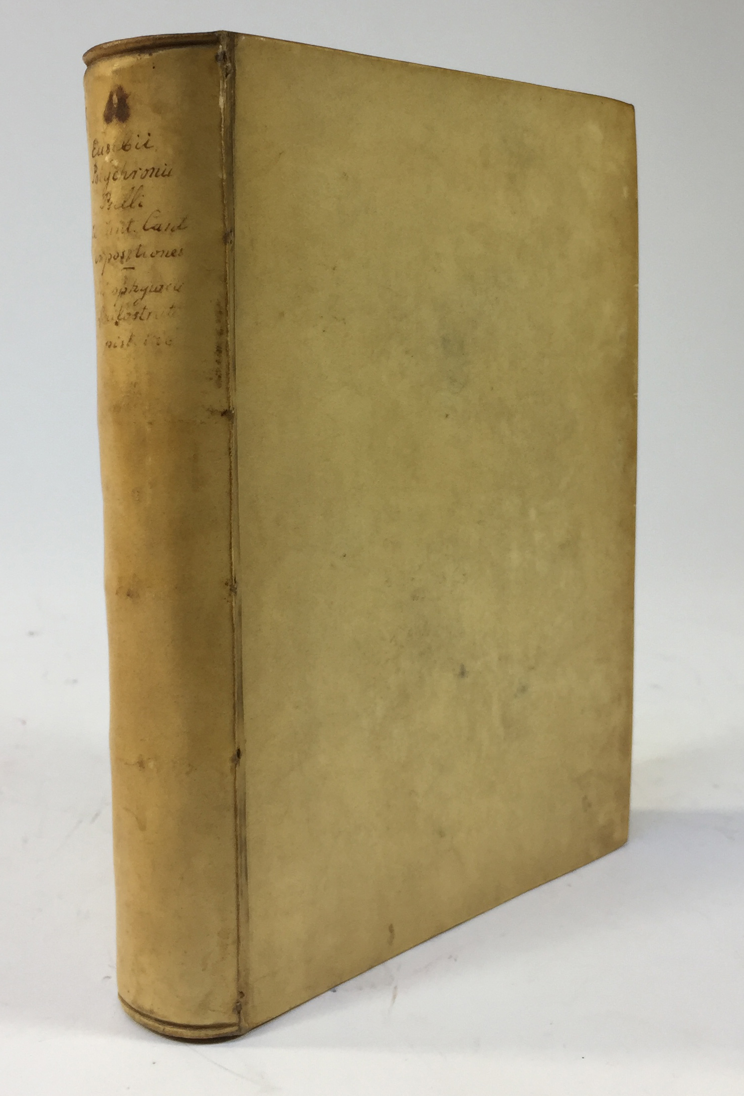 EUSEBIUS, POLYCHRONIUS, PSELLUS. In Canticum Canticorum expositiones Graece. J. Meursius primus nunc è tenebris eruit, & publicavit. Leyden, Ex off. Elzeviriana, 1617. (8), 184 pp. - Bound with: PALLADIUS. Historia Lausiaca. J. Meursius primum Græcè nunc vulgavit, & notis adjecit. Leyden, Ex off. Elzeviriana, 1616. (8), 209, (3) pp. - And: THEOPHYLACTUS. Epistolæ. J. Meursius nunc primùm è tenebris erutas ed. Leyden, Ex off. G. Basson, 1617. (8), 118, (1) pp. - And: PHILOSTRATUS. Epistulæ quædam, partim auctiores ed. J. Meursius primum vulgavit, & adjunxit, de Philostratis dissertatiunculam. Leyden, Ex off. Elzeviriana, 1616. 24 pp. - 4 works in 1 vol. 4°. Fine cont. vellum w. overl. sides & red edges.